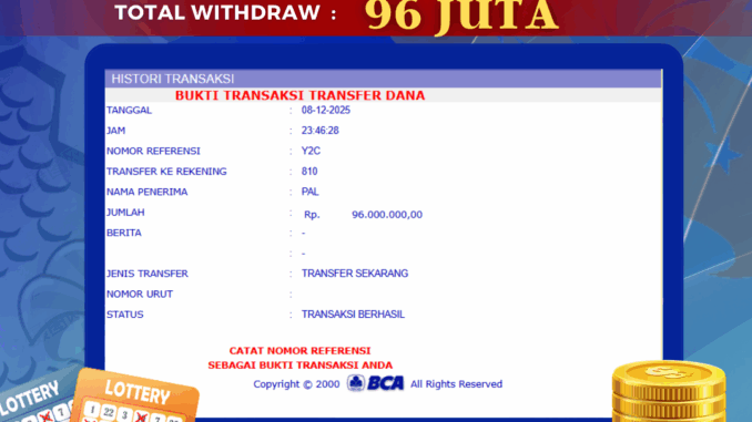 BOLAGILA mengucapkan selamat kepada user id : CAL*** yang telah berhasil mendapatkan jackpot pada permainan TOGEL DI JAKARTA 4D. Kemenangan sebesar Rp 96.000.000,-. telah dibayarkan LUNAS oleh pihak bolagila kepada pemilik user id setelah yang bersangkutan mengisi formulir withdraw. Proses pencairan dana berlangsung sangat cepat hanya dalam waktu 6-11 menit sudah berada dalam rekening pemilik user id.