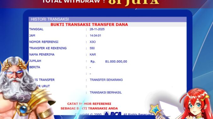 BOLAGILA mengucapkan selamat kepada user id : KAR*** yang telah berhasil mendapatkan jackpot pada permainan SLOT DI ANACONDA GOLD. Kemenangan sebesar Rp 81.000.000,-. telah dibayarkan LUNAS oleh pihak bolagila kepada pemilik user id setelah yang bersangkutan mengisi formulir withdraw. Proses pencairan dana berlangsung sangat cepat hanya dalam waktu 6-11 menit Sudah berada dalam rekening pemilik user id.