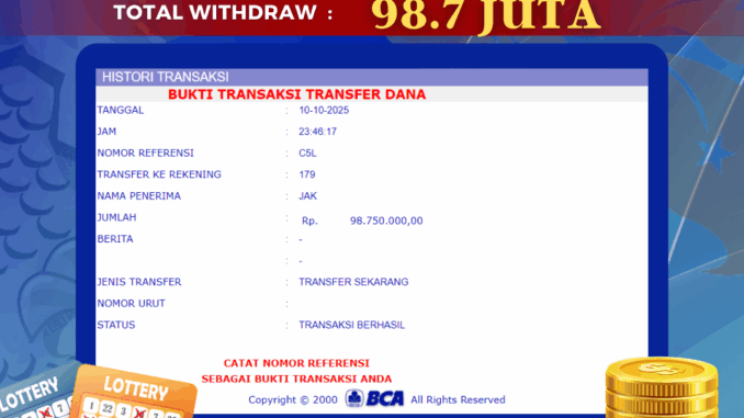 Bukti transfer yang dapat anda lihat adalah bukti SAH / VALID yang langsung di dapatkan melalui bukti transaksi dari Bank yang digunakan untuk pengiriman dana pada rekening pemilik user id. Terima kasih kami sampaikan kepada para pengguna setia BOLAGILA yang telah menggunakan situs kami, sebagai Bandar Terpercaya yang pastinya membayar semua kemenangan member hingga lunas. Apakah BOLAGILA PENIPU ? Reputasi “BOLAGILA TERPERCAYA” sudah sangat melekat.